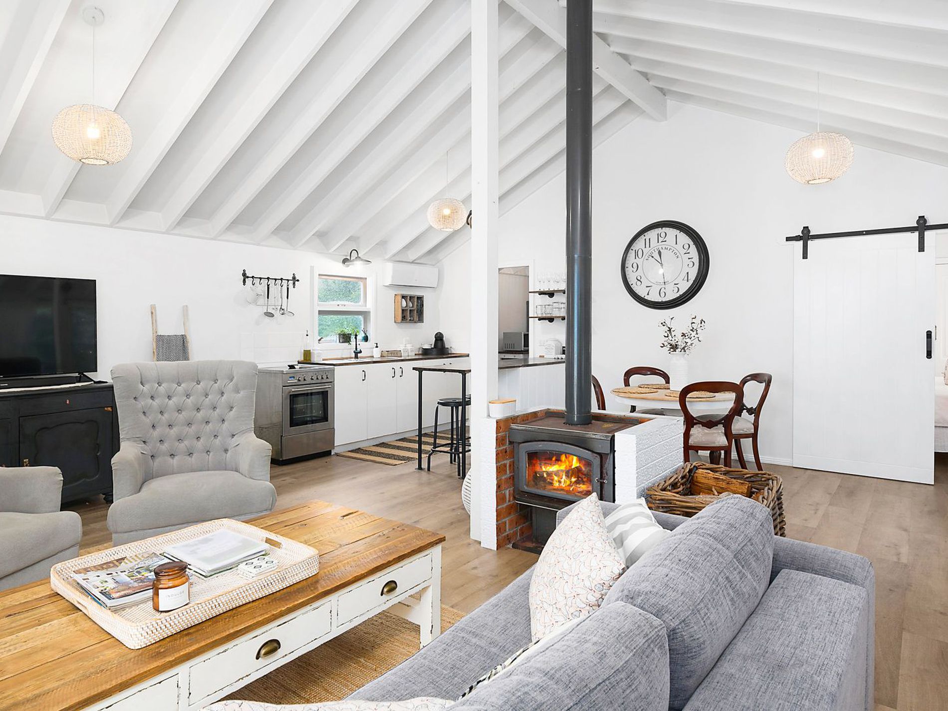 The main residence brings relaxed country charm: 4-5 bedrooms, 2 bathrooms, a large central kitchen with AGA cooker, and a welcoming lounge with open wood-burning fireplace flowing to the garden, swimming pool and covered outdoor living.