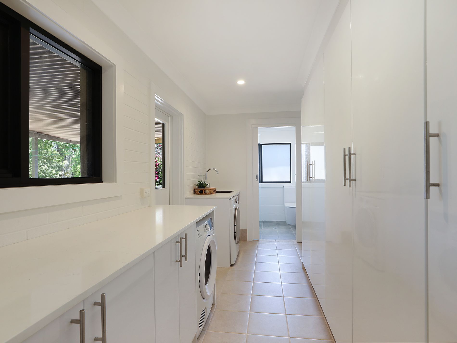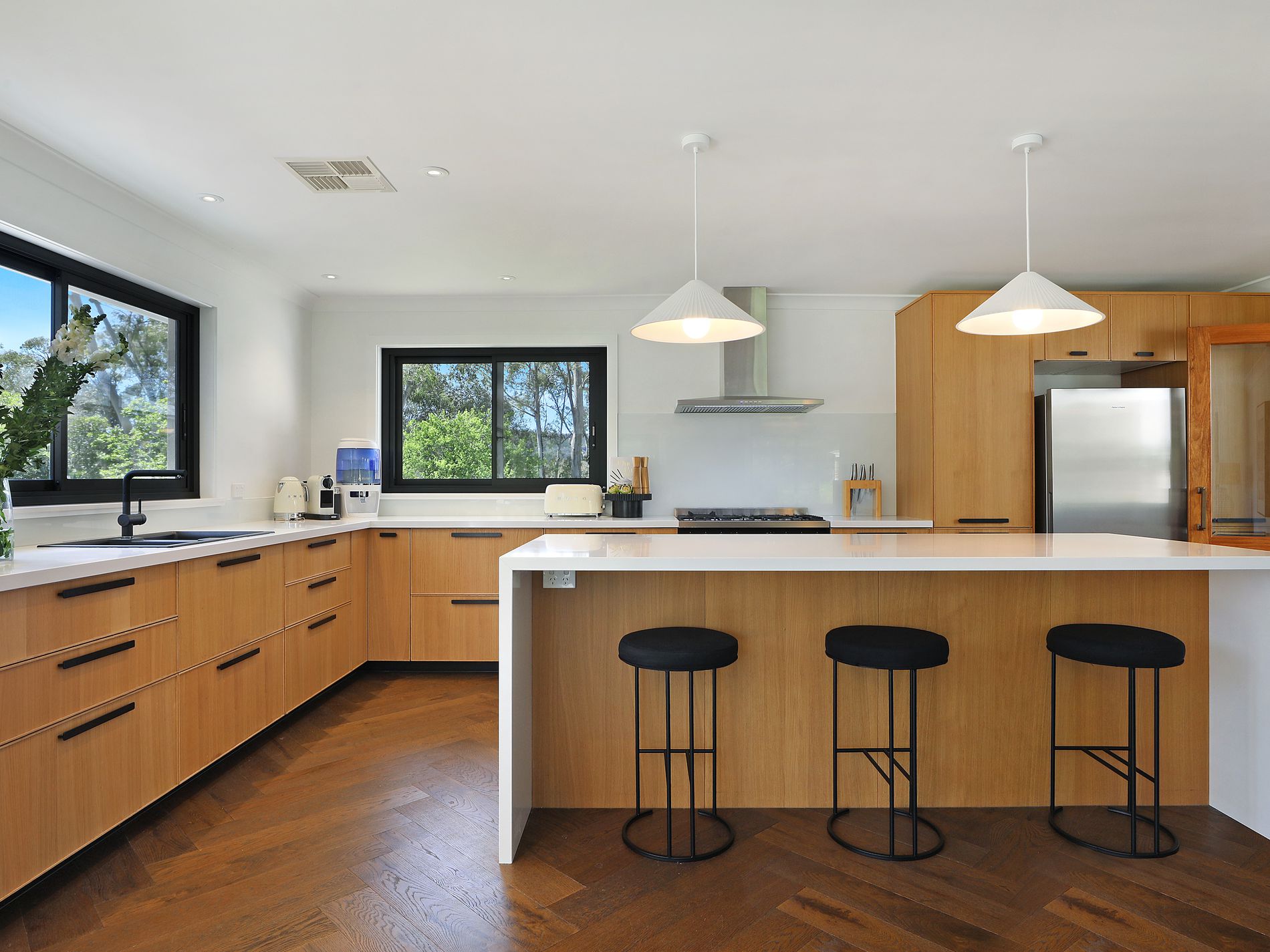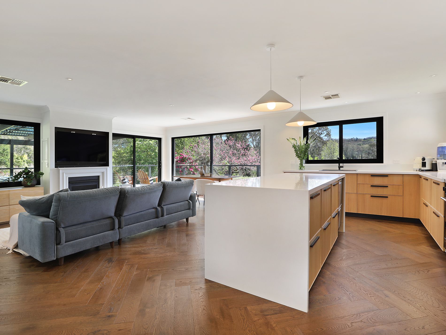 An elegant entrance opens to a glass-wrapped formal living room with striking stone clad fireplace, where sweeping treetop vistas set a tranquil tone for relaxed family gatherings. The open-plan entertainer’s kitchen and family room is framed by sweeping views across Gibbergunyah Reserve which change colour with every season. There is a seamless connection to an expansive timber deck, part covered for all weather dining /entertaining,