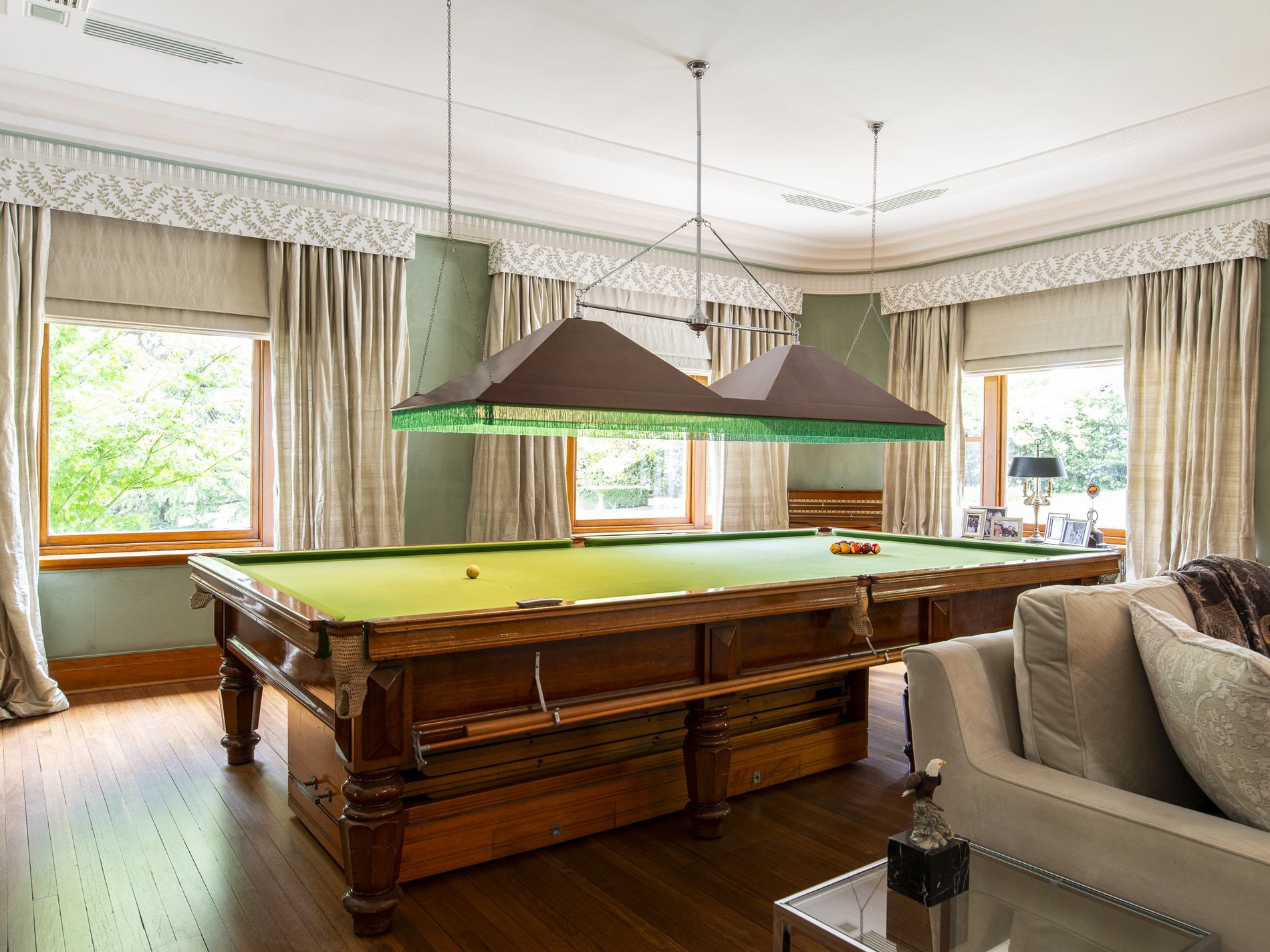 • A vast, light filled ballroom/billiard room with an imposing open fireplace; beautifully decorated with suede covered walls