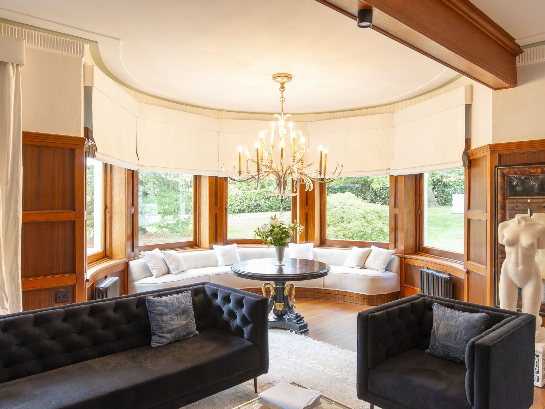 • A handsome entrance opens to north facing living room with open fireplace & elegant bow window featuring an original window seat with sweeping views over the garden & beyond