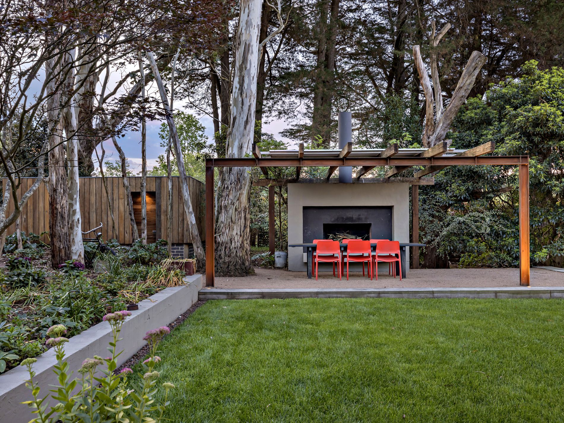 * Outdoor entertaining courtyard with a pergola made with local blackbutt beams around a traditionally built open fire, all lifted lightly by steel portals