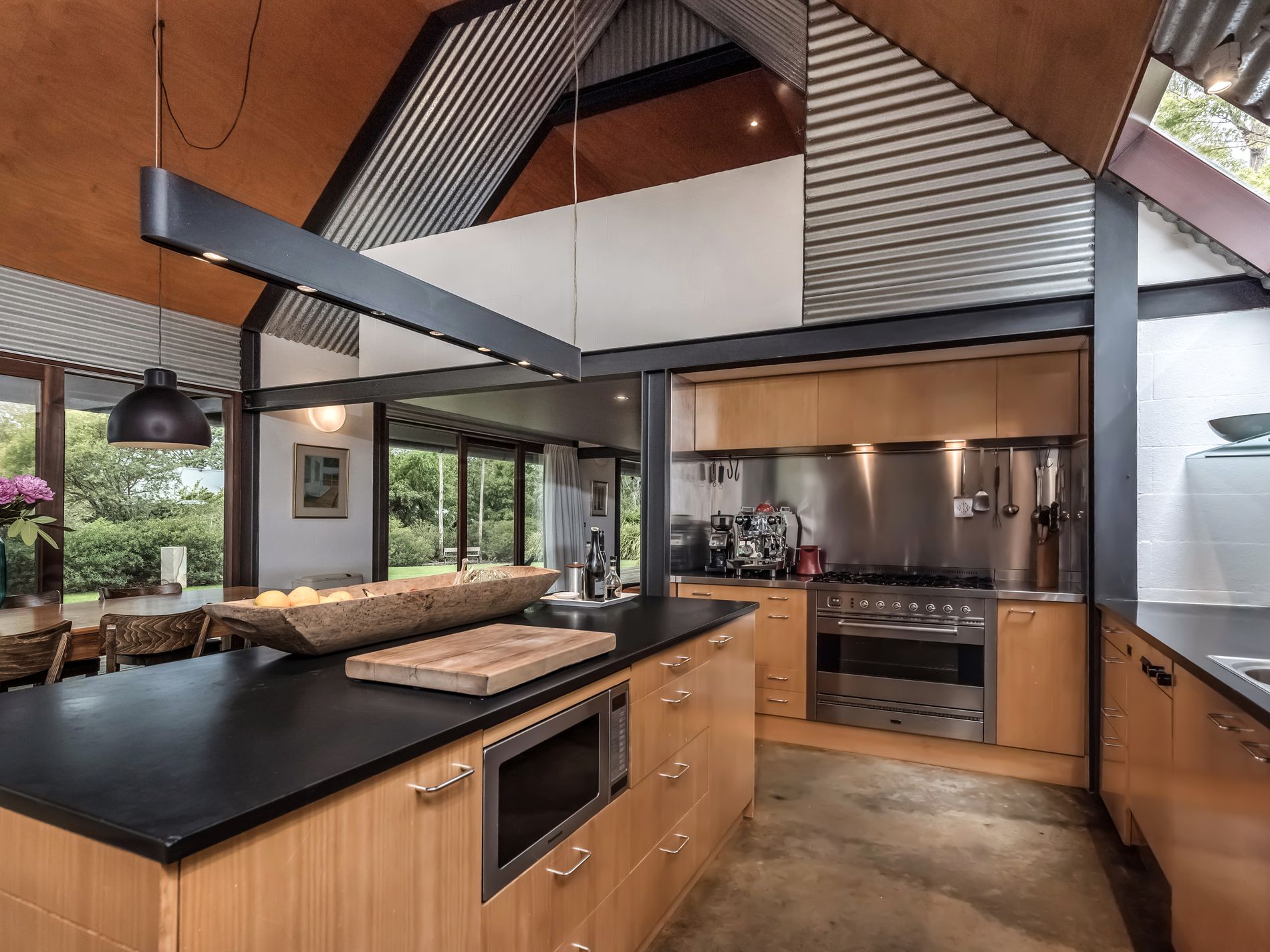 * Large open plan Chef's kitchen and dining with cathedral ceiling and north facing floor to ceiling glazing and windows. Extensive custom-made joinery by Reid Brothers throughout and Mintaro black slate benchtops from South Australian. iLVE integrated stainless steel oven and cooktop