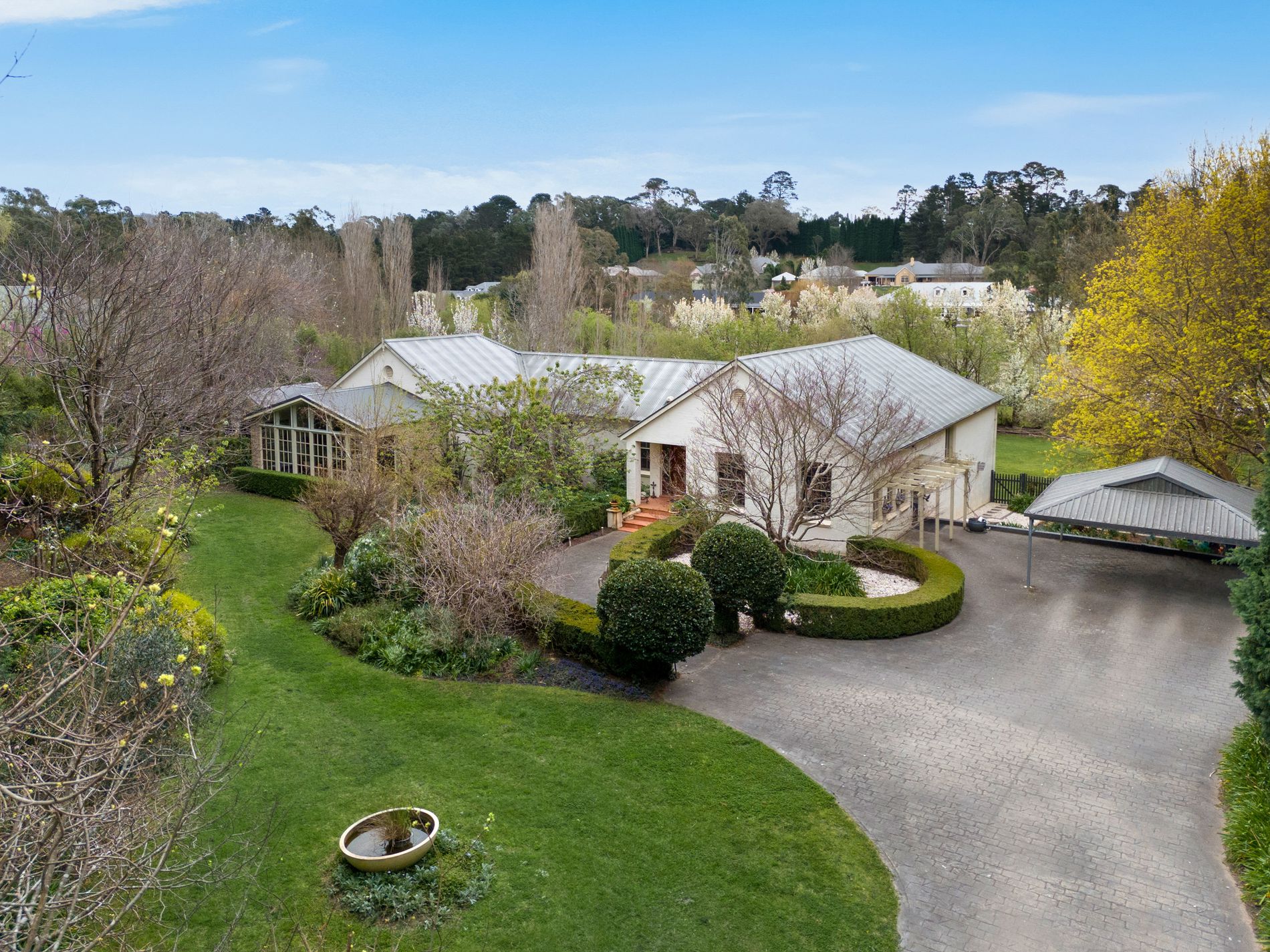 • The driveway opens into manicured gardens with mature trees and shrubs.