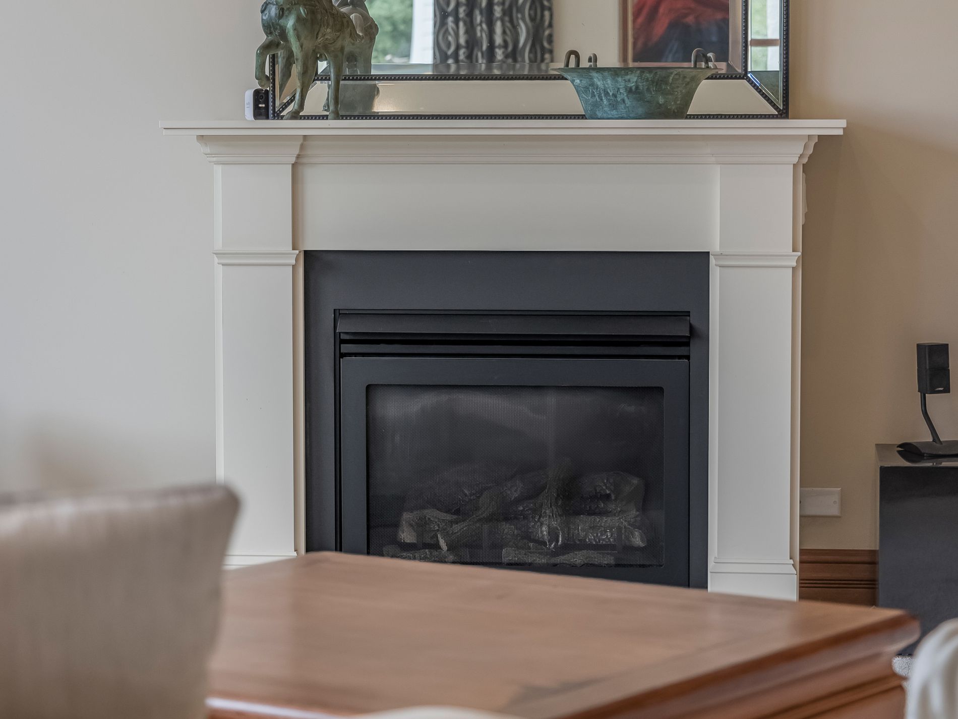 outdoor entertaining terrace. Gas fire in an elegant stone fireplace. Three steps lead up