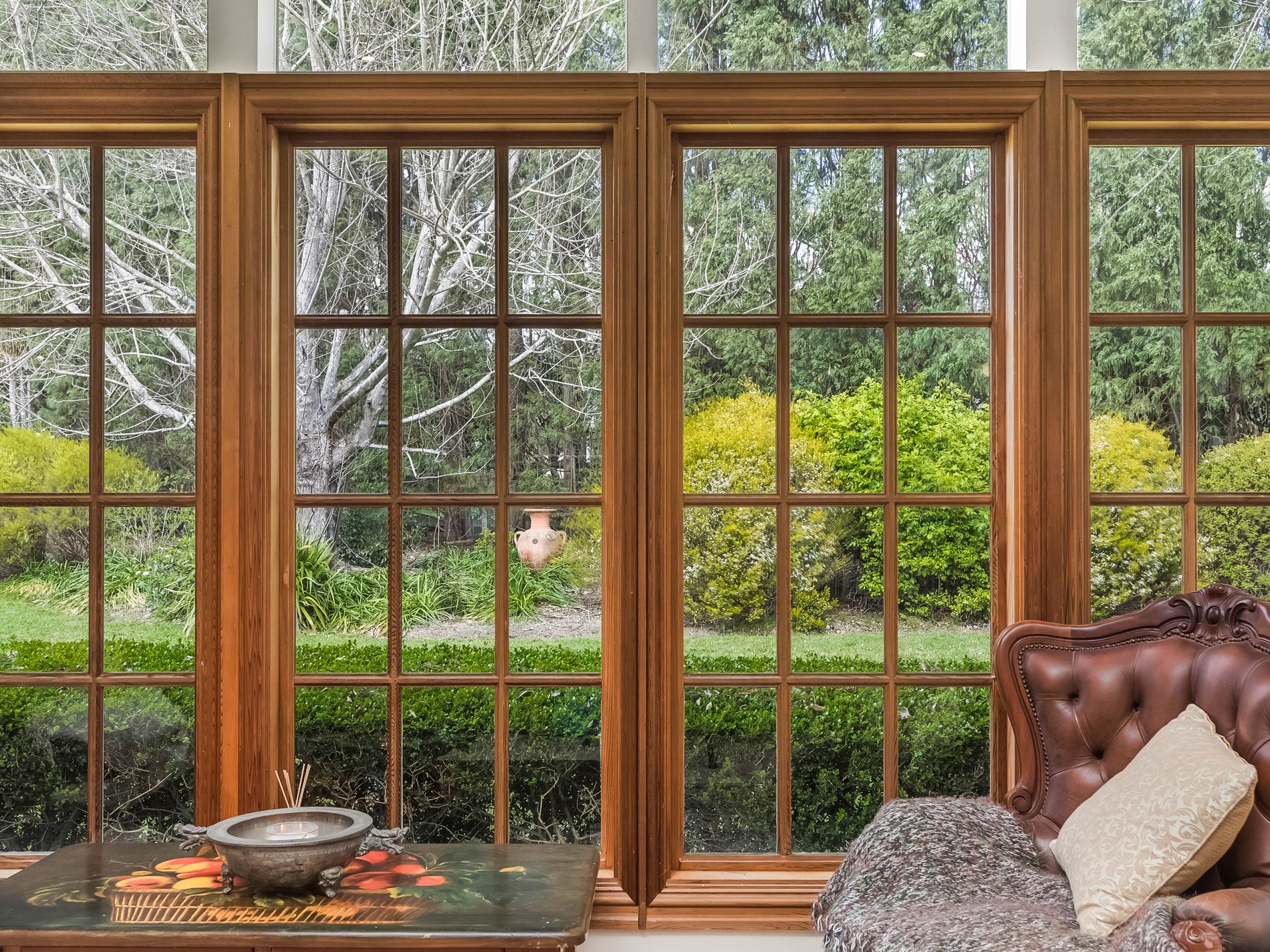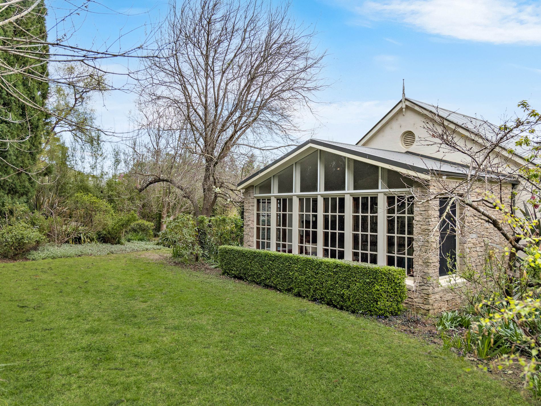 This charming north facing property is immersed in tranquillity and calm. It is completely hidden from the street; the entrance is via a long driveway arriving at a perfectly private oasis with unexpected delights throughout. The rear gardens meander onto public parkland with lake views in the distance, given the sense that both are one. The gardens are sensational with many mature trees and rare plantings.