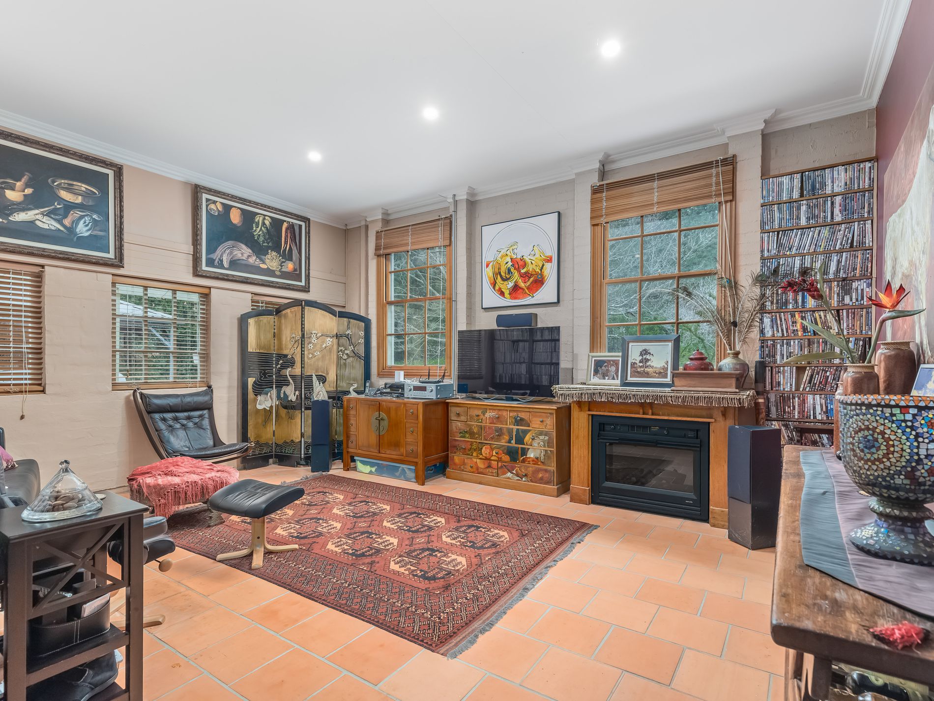 • Enormous split-level living and dining room with large windows and door leading onto an