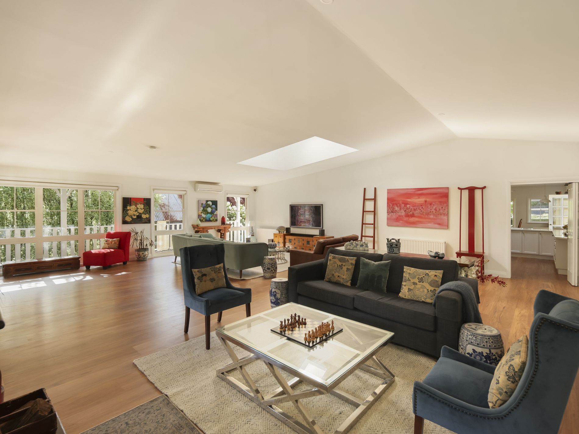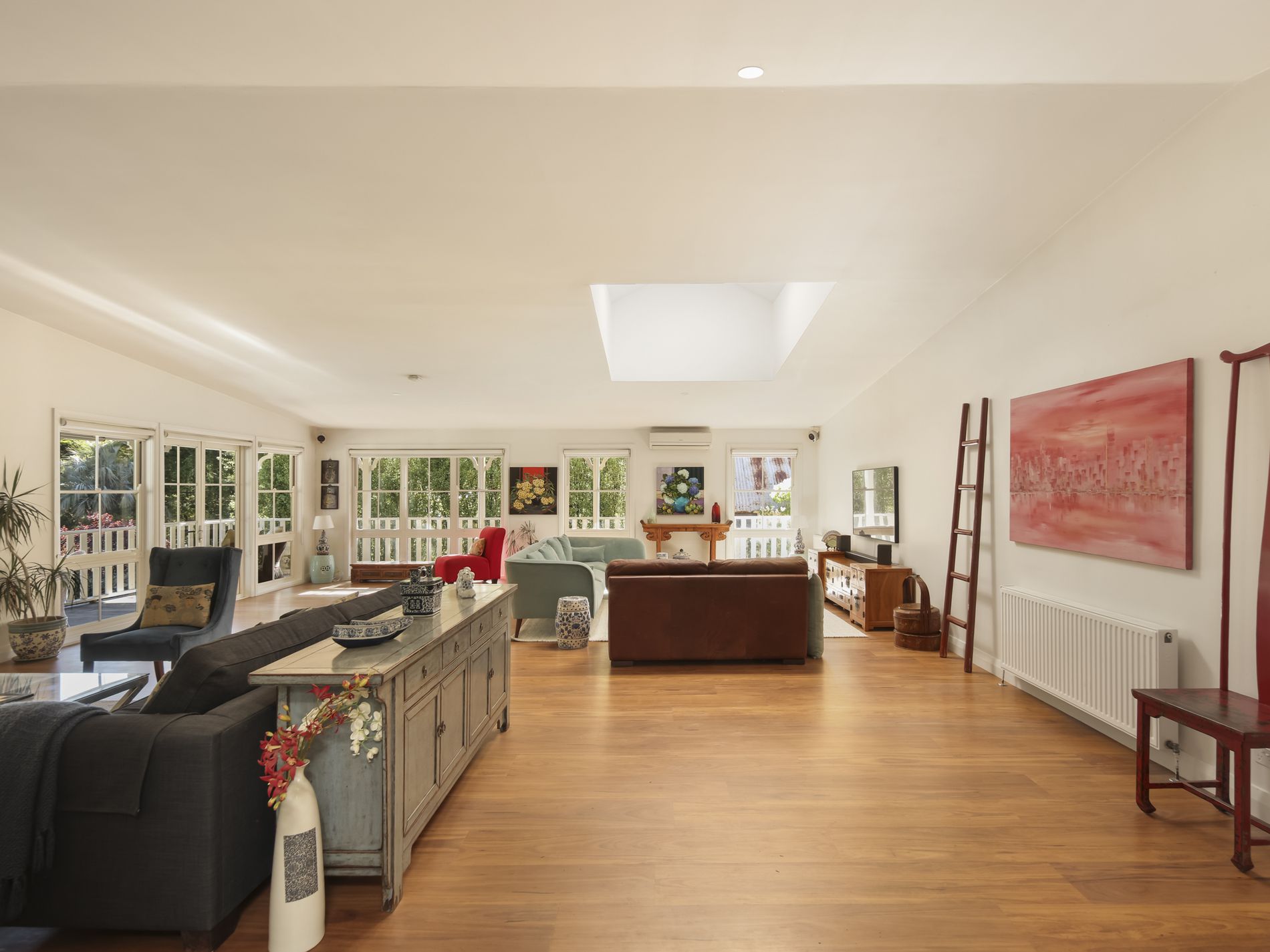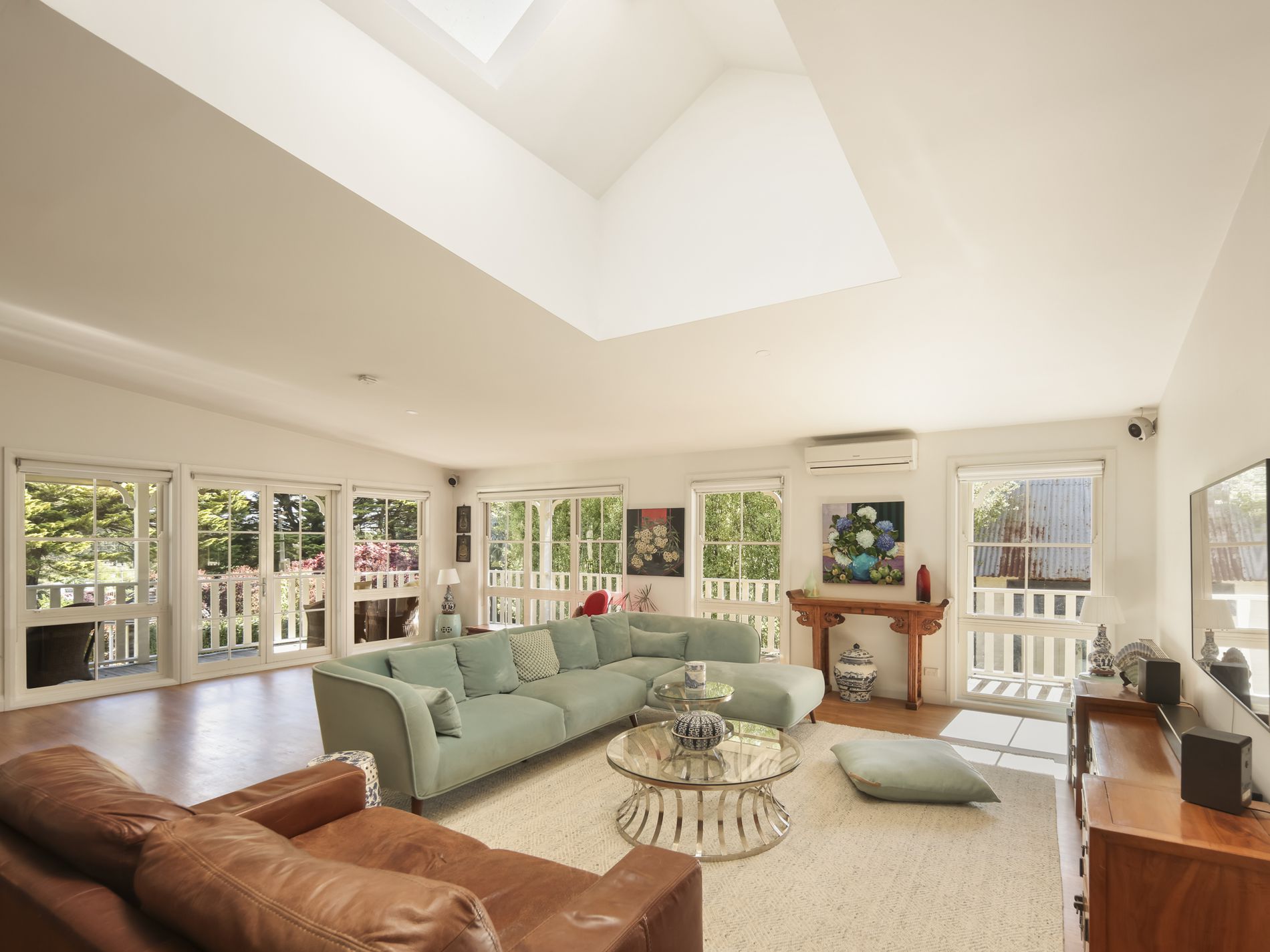 Accommodation is generous and versatile, with five beautifully appointed bedrooms, each with its own ensuite. Multiple living zones include library, formal living and dining within the expansive main living room, where vaulted ceilings are enhanced by skylights, an open fireplace and French doors opening onto wrap-around verandahs. This seamless indoor-outdoor connection extends to sun-filled garden outlooks framed by mature trees.